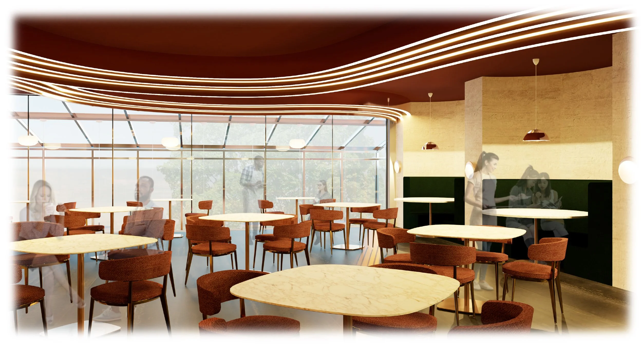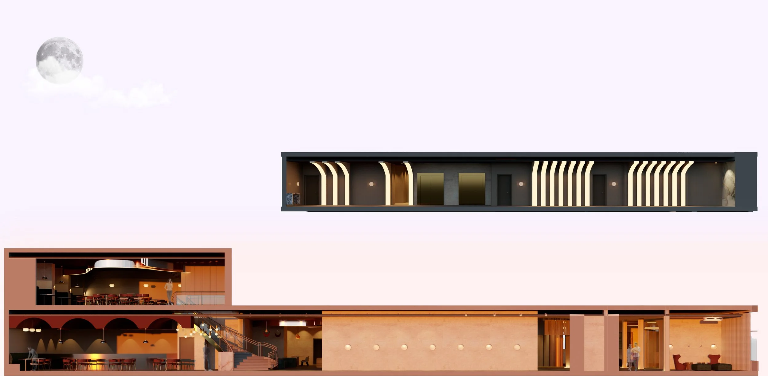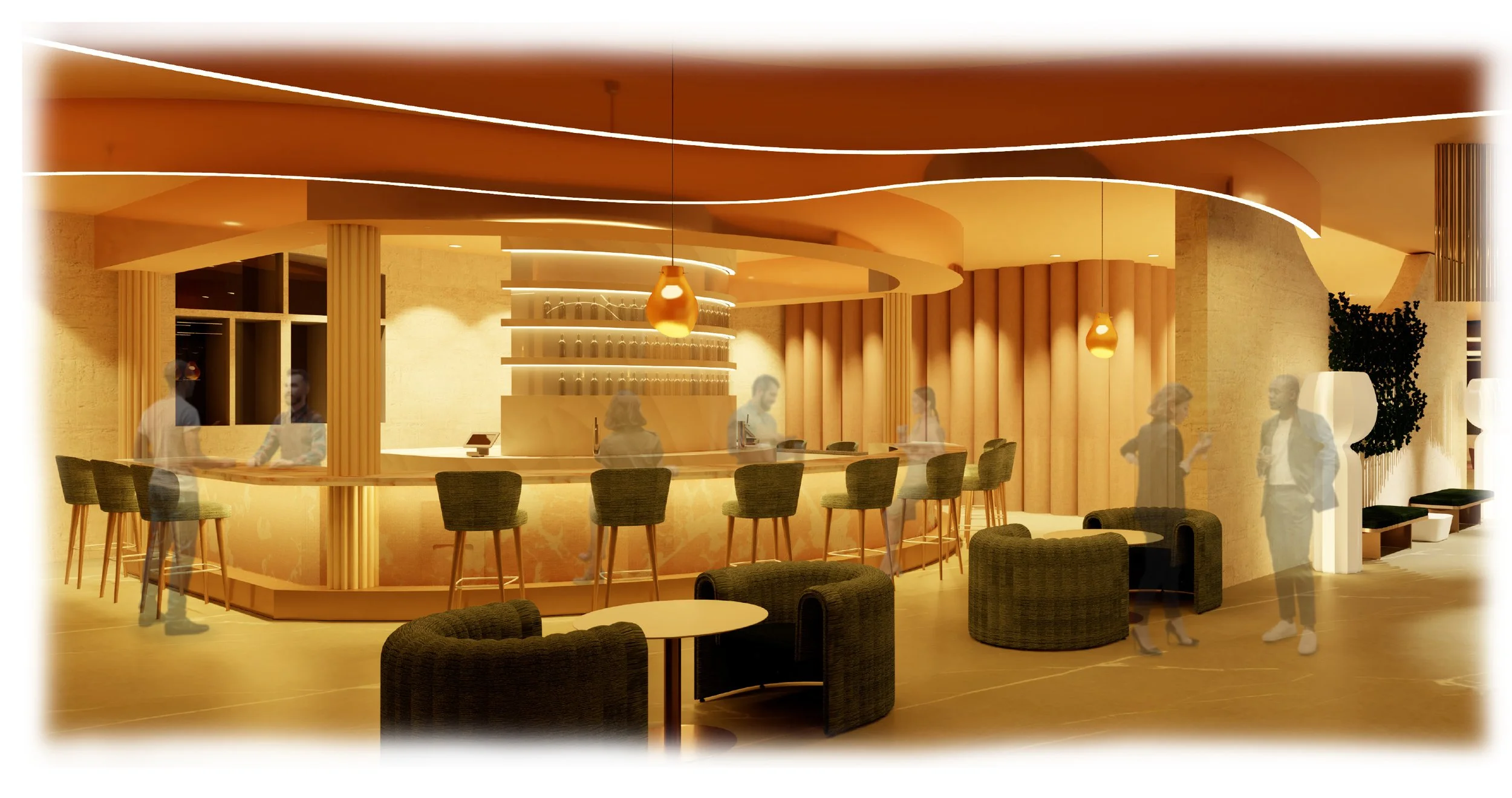 The interior references retrofuturism through the use of shiny, glossy textures and curved, slick surfaces. Mixed metals and copper hues used throughout are a nod to the building’s original function as a tinnery. In a sleek, yet warm atmosphere, the space evokes a sense of fantasy, and allows visitors an opportunity to dream.