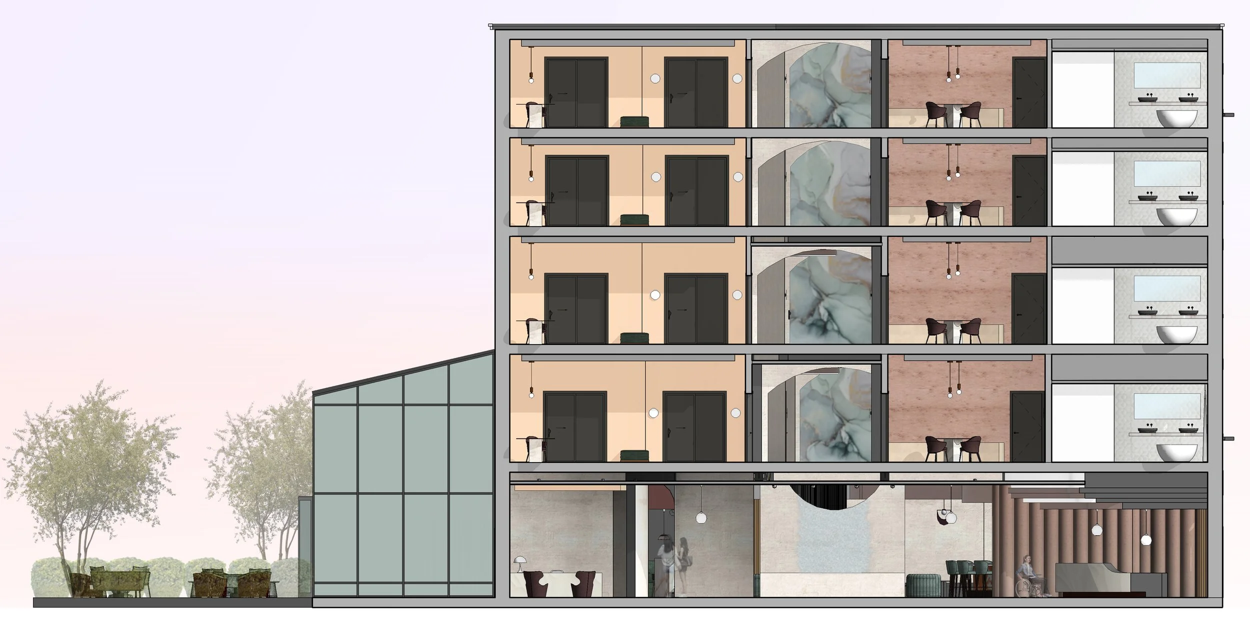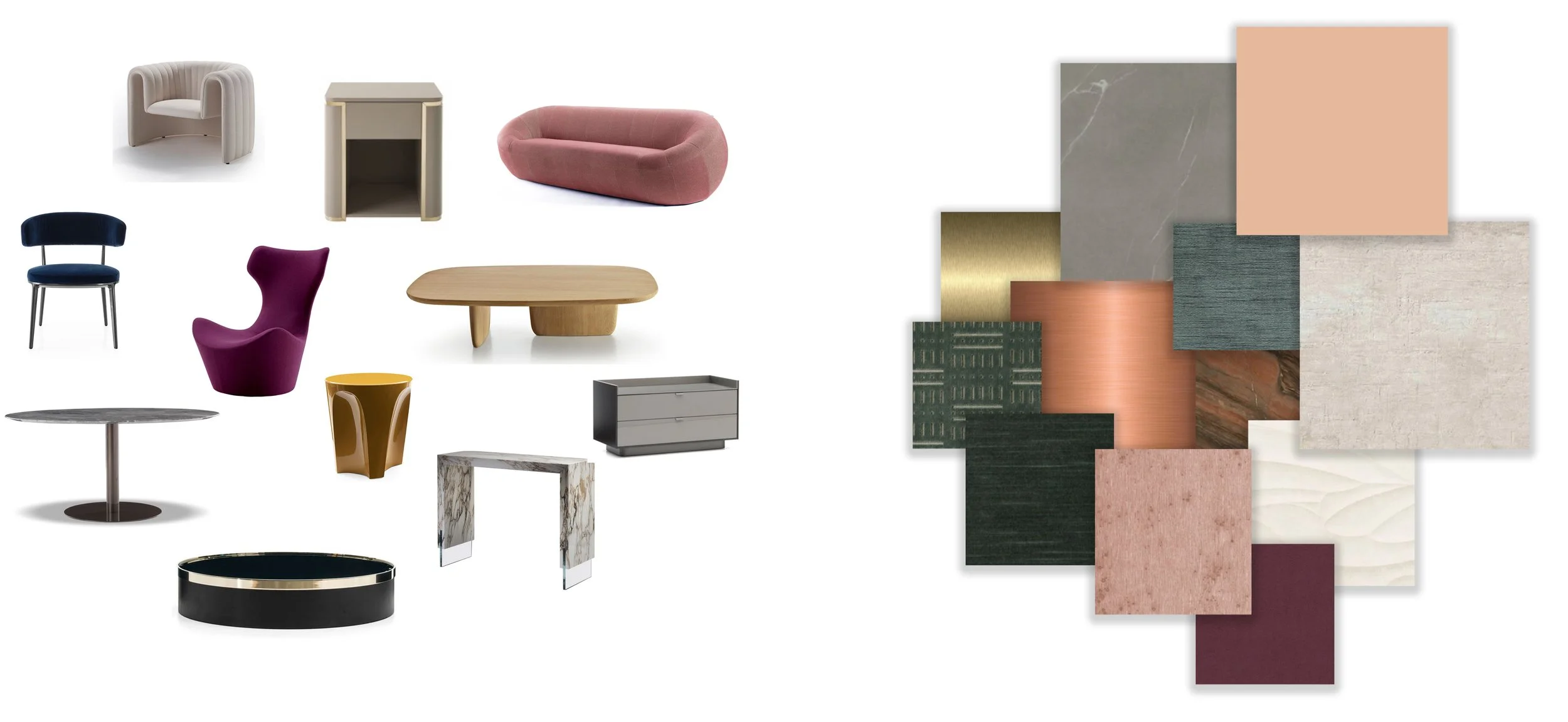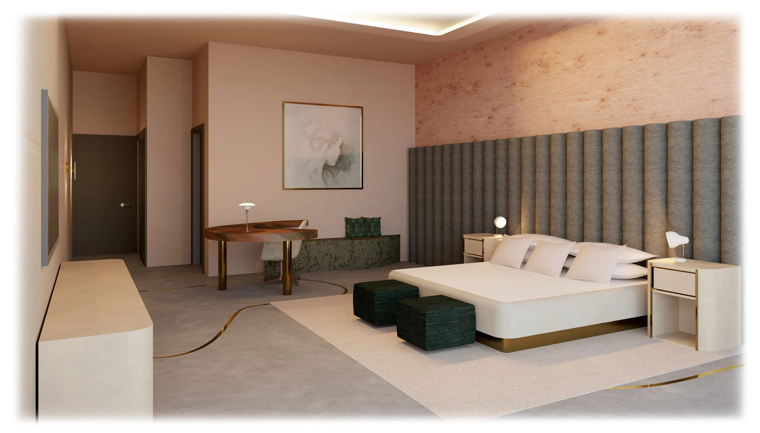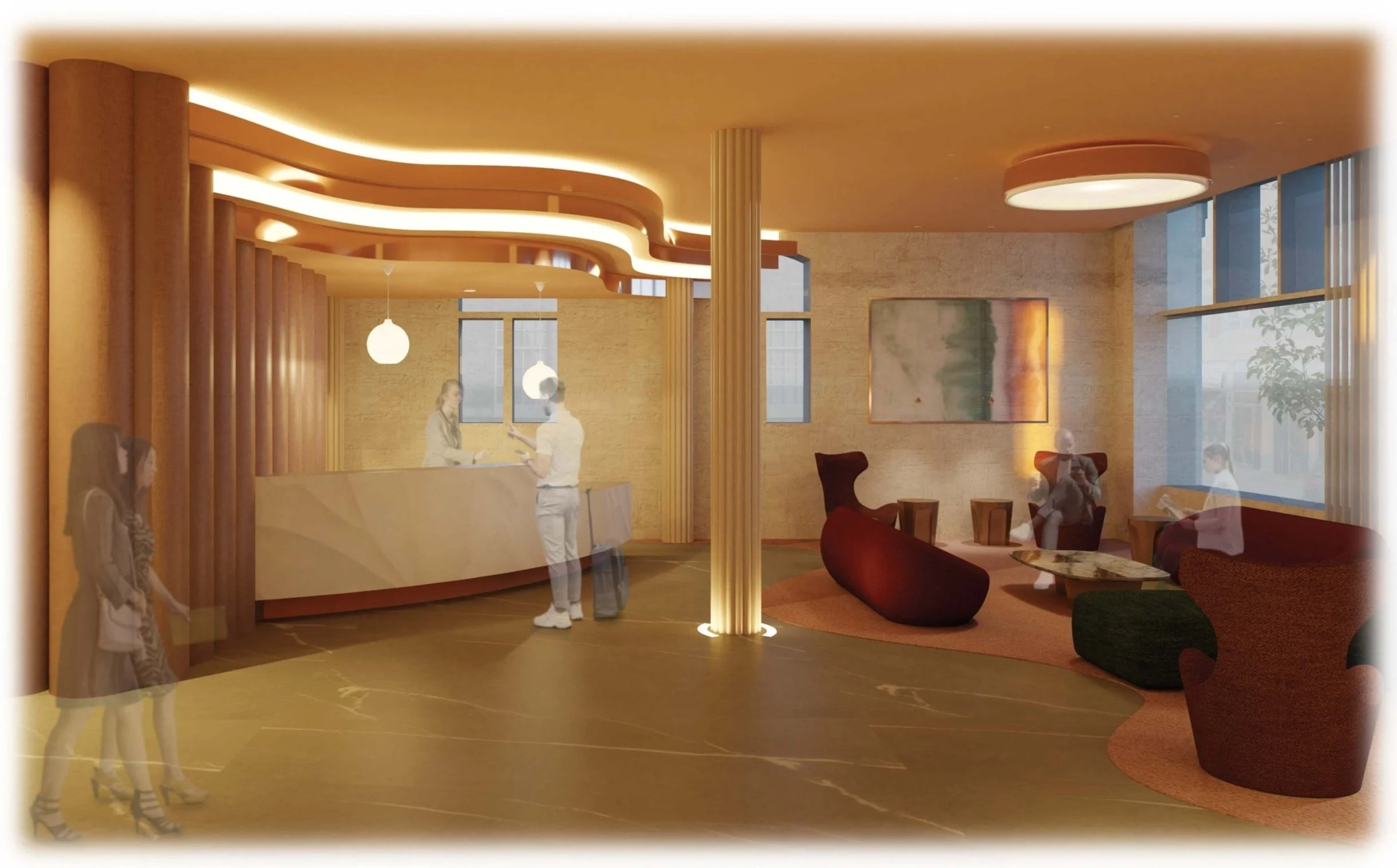 The interior references retrofuturism through the use of shiny, glossy textures and curved, slick surfaces. Mixed metals and copper hues used throughout are a nod to the building’s original function as a tinnery. In a sleek, yet warm atmosphere, the space evokes a sense of fantasy, and allows visitors an opportunity to dream.